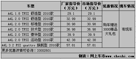 【网上车市】近日,网上车市深圳站记者从深圳奥迪经销商处了解到,目前购买奥迪A4L任一款车型,即赠送3000精品大礼包。店内有现车,想了解更多奥迪系列车型的优惠可咨询:33002601,详细请见下表: