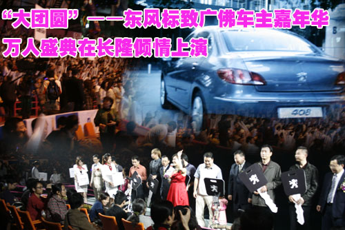 2010年4月10日,东风标致广佛车主嘉年华在长隆国际大马戏剧院倾情上演。本次嘉年华以“大•团圆”为主题,参与人数近万人,场面瑰丽宏大,为东风标致在广州、佛山区域的优异表现画上了浓墨重彩的点睛之笔。