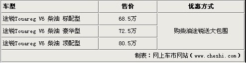 大众进口汽车途锐V6 TDI 3.0的引进,在中国市场提供了动力性与环保表现俱佳的豪华SUV的解决方案,将一股更加清醒的豪华主义引进了国内豪华SUV市场。近日,网上车市记者走访沈阳辽宁川达进口大众4S店时了解到,购买柴油版途锐,送大包围。喜爱这款车的朋友不要错过出手的好时机,详细情况咨询辽宁川达4S店。