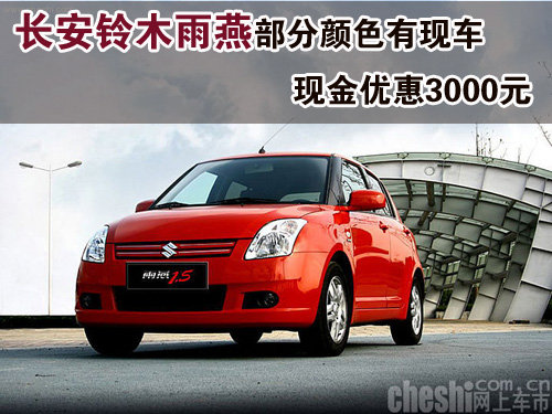 据长安铃木4S店销售人员介绍,目前铃木雨燕在售的车型有2款车型,1.5L豪华版手动型和自动型,2款车型部分颜色有现车,现购车可直接现金优惠3000元。