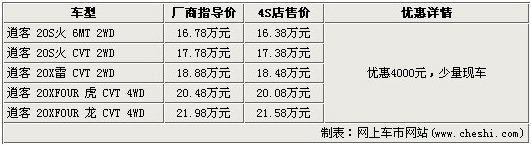 东风日产2010款逍客于2009年10月28日正式上市,共推出5款车型,售价区间为16.78-21.98万元,新款主要是进行了增配及细节部分的优化,而并非是海外推出的改款车型。近期,编者从东风日产经销商处获悉,逍客有少量现车,优惠4000元。具体见下表:
