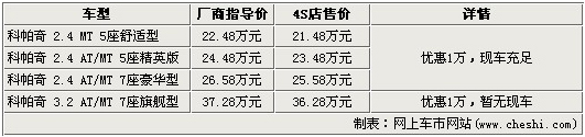 雪佛兰于2009年1月8日,以进口方式引进两款科帕奇新车型,分别是搭载3.2L V6发动机的雪佛兰科帕奇旗舰型,及雪佛兰科帕奇2.4L自动挡5座精英型。两款新车售价分别为37.28万元及24.48万元。近期,我们从雪佛兰经销商处获悉,科帕奇全系优惠1万元。具体见下表: