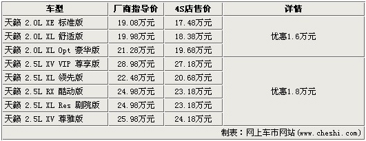 据东风日产销售人员介绍,目前店内天籁全系均有少量现车,近期购买还可享受现金最高1.8万元的优惠。其中,2.0L车型优惠1.6万元,优惠后售价最低仅为17.48万元;2.5L车型优惠1.8万元,优惠后最低售价为27.18万元。由于北京地区各4S店订单不同,各店销售的现车颜色也有所不同,对天籁感兴趣的朋友,不妨致电经销商以便获取更多详情。