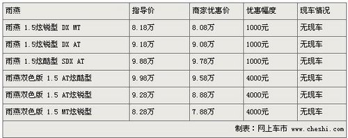 长安铃木的雨燕一直是漂亮MM喜爱的车型,它可爱的外形,精致的内饰,都博取了女生对其的购买欲望。近日,据网上车市了解,目前宁波地区长安铃木雨燕1.5炫锐版中普通版的车型可优惠1000元,但无现车,预定需要1个半多月,双色版车型优惠可达4000元,预定需要两个多月。具体车型售价如下表所示: