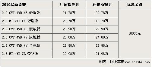 奇骏2010款全车系音响系统升级为数码6碟高保真剧院CD+Audio音响系统,并新增了一款奇骏至尊版,拥有车身包围套装、5.8英寸彩色触摸 显示屏、智能语音导航系统、高保真剧院音响系统、侧可视系统、倒车影像监视系统、可伸缩行李厢遮物帘等七大亮点配置。在银色、黑色等颜色的基础上,奇骏 2010款还增加了玛瑙红车色,更显时尚、动感。