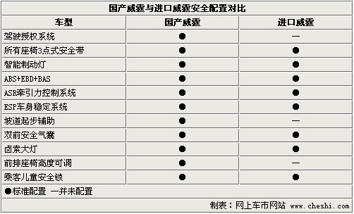 国产威霆售价降低了近23万元,但对比两款车型安全配置,反而国产威霆安全性做得更加到位。国产威霆配备了进口版所没有的驾驶授权系统、坡道起步辅助及前排座椅高度可调,这无形中提升了整车性价比。除此之外,国产威霆还配备了ABS+EBD+BAS(刹车辅助)以及ASR牵引力控制系统、ESP车身稳定系统。对于威霆较大的车身,ESP及ASR的确可以在驾驶过程中起到至关重要的作用,保证了车内所有成员的安全。
