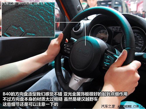 首先需要说明的是,展台上的B40都是试装车,因此内饰部分的表现并不能完全反应出量产后的情况。而北汽B40中控台和方向盘的造型都很令人满意,不过材质就显得有些廉价,尤其是方向盘的材质实在有点太不拘小节了。