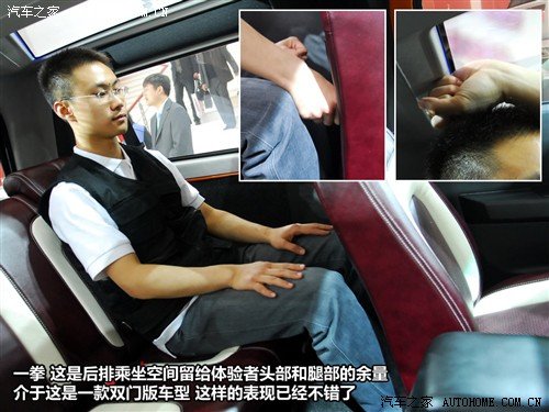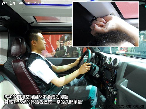 乘坐空间方面,一拳是最常用到衡量标准。前后排头部空间以及后排腿部空间对身高1.78米的体验者来说都为一拳??悸堑奖逼鸅40是一款轴距仅为2400mm的双门版车型,如此的表现已经在可以接受的范围内。只是座椅椅背的造型设计并不能提供较高的舒适性,这也许需要日后的改进。