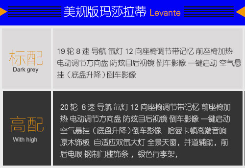 17款玛莎拉蒂Levante系列标配了电控可变阻尼空气悬架系统、巡航控制、玛莎拉蒂稳定性程序、陡坡缓降、坡道起步辅助、电子驻车、胎压监测、电动尾门、前排座椅加热、天鹅绒地毯、全景天窗、主动换挡拨片等。其中,高配车型Levante S还配备有升级版皮革内饰、自适应大灯、大灯清洗等配置。咨询电话;189 0217 3222 张女士(同微信)189 0218 7222 吴经理