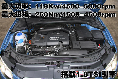 1.8升TFSI发动机在4,500转/分至6,200转/分可输出最大功率118千瓦,在1,500转/分至4,500转/分可输出250牛•米的最大扭矩。这款发动机匹配6挡手动变速箱或7速S tronic变速箱,其动力表现完全超越了同排量级别的自然吸气式6缸汽油机型,以匹配7速S tronic的A3 Sportback车型为例,其0到100公里/小时加速成绩仅为7.7秒,最高车速可达222公里/小时。