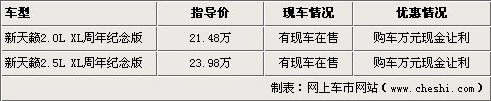 近日,编辑从东风日产新世纪专营店了解到,新天籁周年纪念版有现车在售,而且目前购车还可获得万元的现金让利,新天籁周年纪念版分别有2.0和2.5的排量,所谓纪念版则是在2.0L XL 舒适版和2.5L XL 领先版的基础上加装了NAVI智能导航系统/倒车影像监视系统/DVD播放器三个套件,此次的版本和优惠还是比较实惠的,感兴趣的朋友不妨关注下。