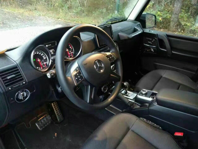内饰方面,新款G 500配备AMG版高性能方向盘,使用黑色Nappa真皮包裹,手感出色,集成了多个常用的多功能按键,同时具有换挡拨片。座椅具有多向电动调节、座椅记忆、座椅加热等功能。新车提供多种颜色搭配,提供designo黑色钢琴漆饰件,也可以选装designo香槟白色钢琴漆饰件。新车搭载的全新的COMAND NTG 5信息娱乐系统包含了具有特别附加越野功能的导航系统、LINGUATRONIC多媒体语音控制系统等功能。
