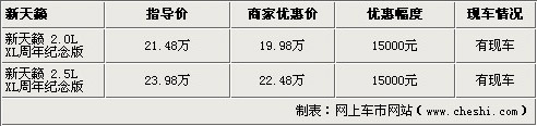 近日,笔者从东风日产东北汽贸4S店了解到,新天籁周年纪念版已到店, 车型分为新天籁2.0L XL和2.5L XL周年纪念版两款车型,目前购车还可优惠1.5万元,详情见下表: