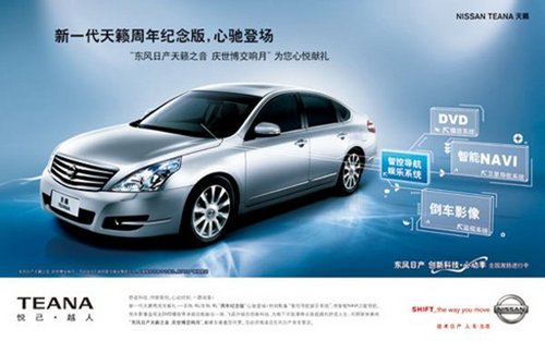新天籁周年纪念版,在原有顶级豪华装备的基础上增配DND系统(集DVD、倒车影像和NAVI导航于一身),为消费者提供配置更为齐全、更具竞争力的车型选择,也将进一步满足消费者对新天籁豪华配置的需求。