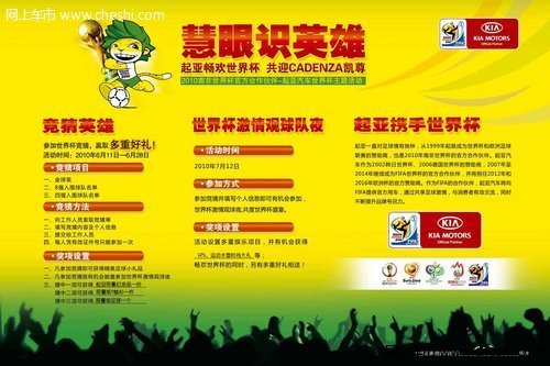 网上车市厦门讯:记者从进口起亚福建总代理富饶车行获悉,起亚作为2010年南非世界杯官方赞助商,又即将迎来全新英雄车型豪华智能型动感轿车-CADENZA。 现举行“慧眼识英雄”世界杯竞猜活动, 凡光临展厅参加都有精美礼品赠送,猜中有机会获得时尚大奖,还可被邀参加世界杯决战之夜,当晚更有丰富奖品等您拿!