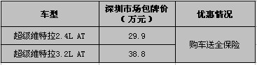【网上车市】近日,网上车市深圳站记者从深圳进口铃木经销商处了解到,现进口铃木超级维特拉系列车型包牌购车,另赠送全保险。想了解更多进口铃木系列车型的优惠可咨询:33002601。详情请见下表:
