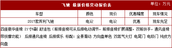 2017款宾利飞驰现车高配钜惠献礼。厂家直销价格优惠。完美融合精湛考究的手工工艺以及最大功率507马力的澎湃动力,为车主带 来尊享驾乘体验。锋利的棱线为飞驰勾勒出更时尚的外观,重新设计的大灯新增了日间行车灯功能, 行车更安全。咨询热线:180-2000-5655 孙经理(同微信)