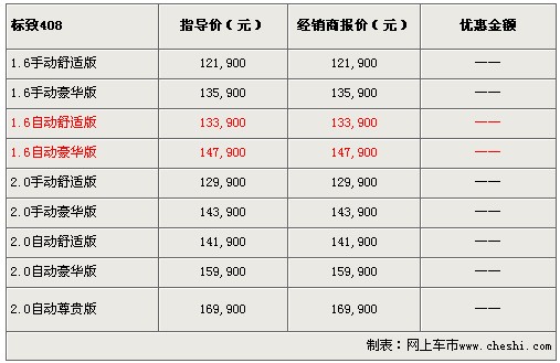 近日,编者从东风标致了解到,东风标致408再新添两款车型,分别是1.6L自动档舒适版和1.6L自动档豪华版。自此东风标致408有9款车型,价格12.19万~16.99万元不等。据悉,目前标致408 1.6L自动档车型已经全面接受预定,不过全系车型目前仍然没有优惠。更多信息可咨询020-85551760。
