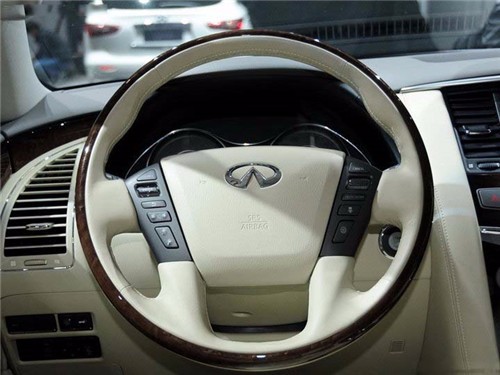 2017款英菲尼迪QX80惯用的四幅风向盘设计,粗细比较合手再加上真皮加实木的用料,手握感觉极佳。另外方向盘功能强大,集成了音响、空调控制及蓝牙车载免提系统,使驾驶者在行车中更为安全,做到手不离方向盘。