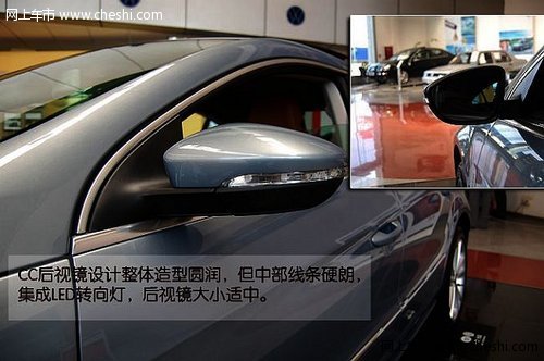 CC后视镜设计整体造型圆润,但中部线条硬朗,集成LED转向灯,后视镜大小适中。CC后视镜设计很到位,镜面尺寸大小适中,外形造型圆润,但中部线条不缺乏硬朗感,后视镜集成LED转向灯。