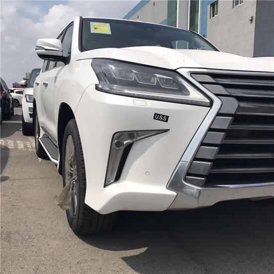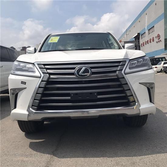 中东版17款雷克萨斯LX570配置: 5.7V8 带雷克萨斯标的地射灯 抬头显示 21轮 ??仄舳?外置脱钩 车身防擦条, 流水式转向灯 138升双油箱 SPORTPLUS标(运动加强版,底盘及发动机运动模式调校) 换挡拨片 冰箱 天窗 智能卡 电眼 环影 后娱 底盘升降 前座椅通风加热(真皮)后座椅通风 导航 倒影 桃木多功能方向盘 桃木内饰 铝制行李架 航空照明脚踏 LED 氙灯 大灯清洗 迎宾灯 四区空调 三排电动 电尾门 拖车钩 风挡玻璃除冰功能 雷达测距等。