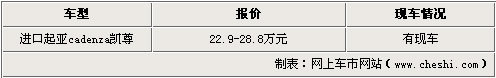 近日记者从辽宁同和了解到,8月19日正式上市的进口起亚重量级车型凯尊(cadenza)现车已到店。据介绍,该车开发共耗时5年时间,投入约2.9亿美元,是起亚公司寄予厚望的豪华车型,它代表了起亚品牌目前最高的造车理念与技术,呈现出焕然一新的完美外观与气质。具体售价见下表: