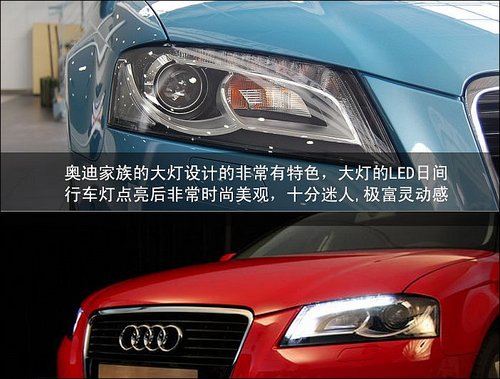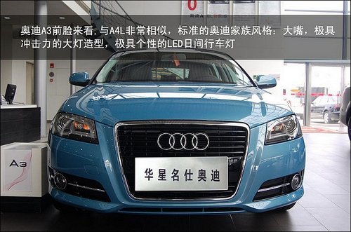 奥迪A3前脸与奥迪家族的A4L非常相似,具有标准和奥迪风格,采用大嘴造型,大灯非常有特色,造型冲击力强,LED日间行车灯非常具有个性。日间行车灯点亮以后,十分迷人,极富灵动感!