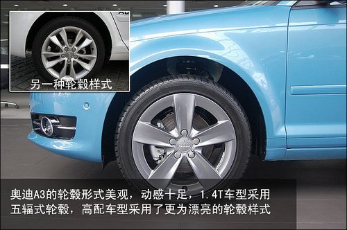 奥迪A3轮毂样式美观,1.4T车型采用五辐式轮毂,动感十足,高配车型采用了造型更为动感、轮廓更为分明的五辐轮毂。