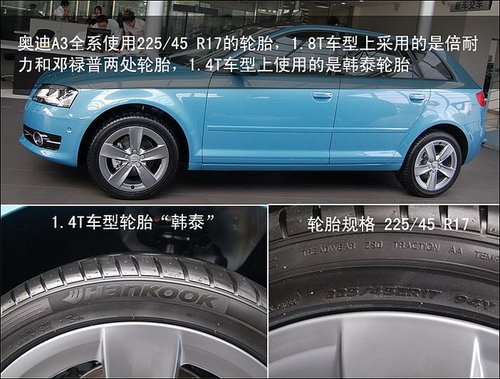奥迪A3全系使用225/45 R17规格的轮胎,1.8T车型上采用的是倍耐力和邓禄普两种品牌的轮胎,1.4T车型上使用的是韩泰轮胎,在这个品牌的轮胎在国内大众车型中很常见。