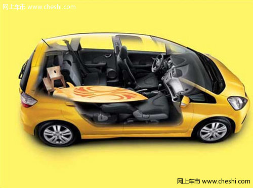 用小型轿车平台”。所以 飞度的内部空间表现一流,没有丝毫的局促感, 短前鼻使车厢有了更大的空间,不过这也产生了一个问题,就是A柱在转向时有视线盲点,需要注意。值得一提的是飞度突破性地将油箱放在全车中部的前排座椅底下,取代传统位于后座底下的设计,所以后备厢的容积达到了惊人的500L,同时给后排提供了更多的变化机会。