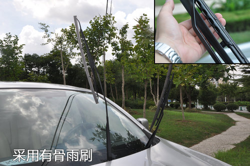 逍客的前风挡采用有骨架、可变间歇式双雨刷,没有采用流行的无骨雨刷让人遗憾。