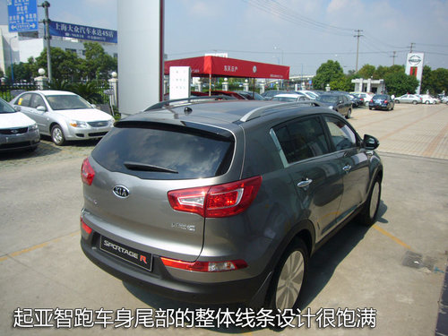 起亚智跑车身的上半部分线条采用了跑车式的流线设计,延至后尾灯的高腰线设计机上车门下半部分特意设计的凹纹,使智跑侧面层次感更强。车身尾部的真题线条设计的很饱满,双色且厚实保险杠展现了智跑硬朗的一面。