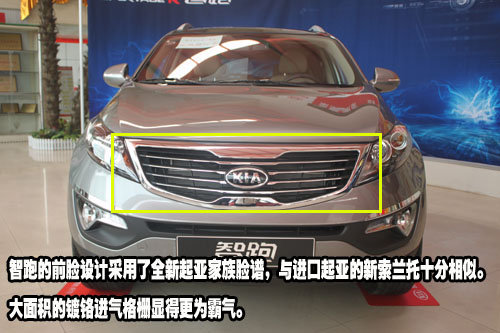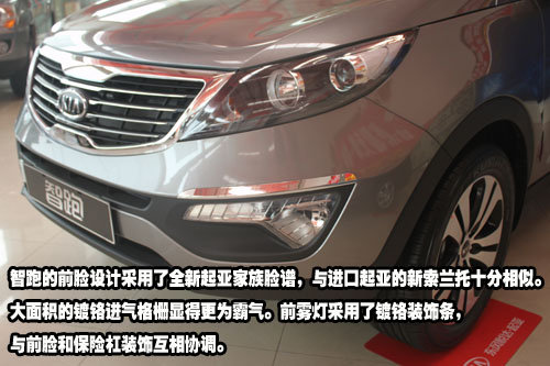 东风悦达起亚智跑的前脸设计采用了全新起亚家族脸谱,与进口起亚的新索兰托十分相似。大面积的镀铬进气格栅显得更为霸气。前雾灯采用了镀铬装饰条,与前脸和保险杠装饰互相协调。