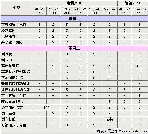 从上表我们可以看出东风悦达起亚智跑的安全配置还是差距较大的,但是基本安全配置还是比较齐全的,双安全气囊、ABS+EBD在所有车型上都配备了,非常一提的是全系车型还配备了电瓶防耗和并线快闪这些细腻的配置。在GLS以上配置的车型智跑都配备了侧安全气囊、车辆动态系统、下坡辅助系统以及15英寸刹车盘,大大提高了智跑的安全性。2.4顶配车型的配置则更加全面。侧安全气帘、倒车影像都可以在其身上找到。