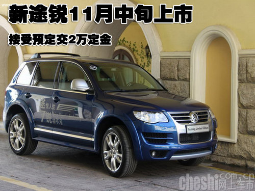 据经销商销售人员介绍:大众新途锐将于11月中上市,售价暂不明确,但大众进口4S店内已经可以接受预定,只需交纳2万元订金即可。因目前订车人数较多,提车时间暂且不定,还需根据新途锐上市之后情况再定。