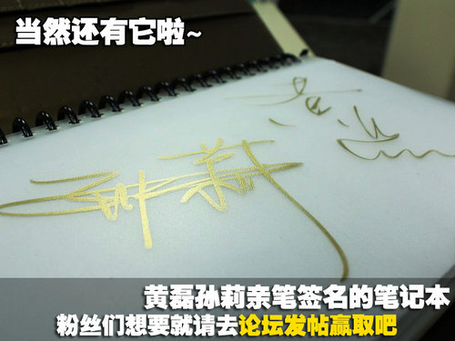 最后,黄磊和孙莉还亲自为纪念品签名留念,并且还特地接受了网上车市网站的专访。最后还有一个惊喜哦~黄磊和孙莉亲自为网上车市的网友们亲笔签名了笔记本,广大车友和黄老师还有莉姐的粉丝们,赶快来车市论坛点击赢取吧。