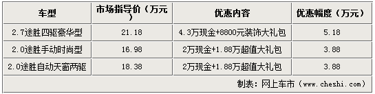 途胜一直是北京现代的主打车型,本次高达3.88万元的优惠绝对是您购车的好时机!