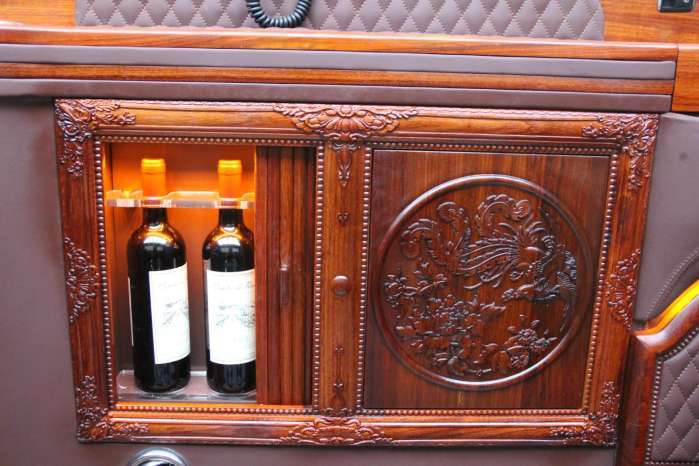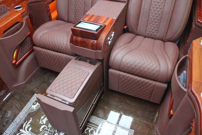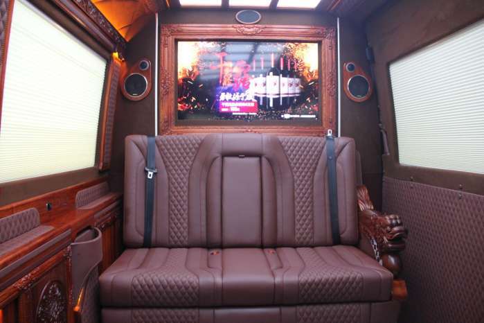 全铝材铸造的中心隔屏将奔驰斯宾特的驾御室与贵宾舱做了一个活络且多变的切开,正是根据此项,置顶规划的42寸SONY液晶电视,高光泽弧面造型的木纹饰板形似聚宝盆,有工风格顺、财运亨通之涵义。