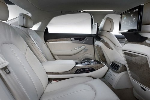 在车厢内部,奥迪A8L后排空间宽敞,而且相应配置极为丰富。在后排电动可调座椅之间具有全尺寸控制台,其他豪华配置还包括折叠小桌以及车载冰箱等。后排座椅除了可前后调节外,还可以调节倾斜度以及坐垫深度,此外还提供??匕茨δ埽煤笈懦丝途∠硎媸?。其他配置还包括四温区空调系统,19喇叭Bang & Olufsen音响系统、10.2英寸液晶显示屏等。