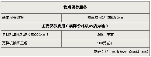 2010款欢动整车质保为两年或6万公里(以先到为准),日常保养周期为5000公里,新车在行驶2500公里左右可到店做免费首保。之后每7500公里做一次小保养(更换机油机滤等),小保养的价格在200左右。大保养则根据车况而定,一般费用在500元左右?!?a >网上车市深圳站】