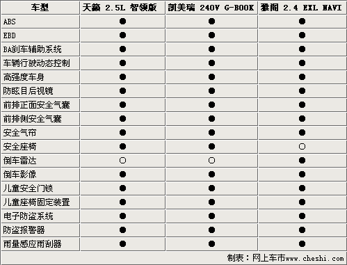 随着汽车市场的日益成熟,安全能力逐渐也成为了车主最为关心的问题。以上三款车型均是该车系中的顶配车型,所以安全配置均比较全面。从表可以看出ABS+EBD和6安全气囊均成为了这三款车型的标准配置。同时它们也全都配备了车辆行驶动态控制系统,大大提高了整车安全性能。全新天籁和凯美瑞雅阁还提供了安全座椅,这一点非常值得称赞。另外这三款车型均装备了自动防眩内后视镜,更加保障了夜间行车的安全。