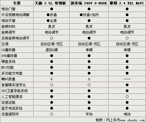 通过上述描述,相信您对这三款日系B级车有了一个大致的了解。东风日产全新天籁在增配的同时保持了原有价格,大大提高了该车的性价比。凯美瑞造型大气,周到的安全保护和全面的配置绝对能够满足大多数公务用途。雅阁在市场上有着绝对的号召力和保有量消费者对它的反应更是有口皆碑的,是个不折不扣的全能车型。三款车可以说是各有各的特点和优势,至于最终的选择还要看消费者你的实际需求了。