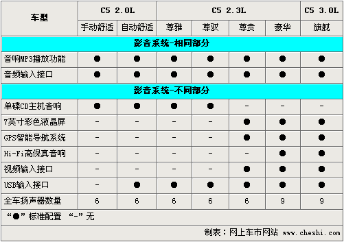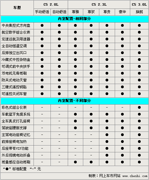 配置方面的丰富程度相信图表能够证实,而上图所列的配置只是较为重要的一部分,2011款C5的最大变革是全系标配了电动天窗,其次具有代表性的集控式方向盘也是最大卖点之一。定速巡航、自动恒温空调、后排双独立出风口和外部??毓乇粘荡暗裙δ芤簿当曜寂渲?,而电动记忆座椅与加热、后座VIP功能、电动折叠后视镜等高级配置只在尊贵版以上车型中才出现。