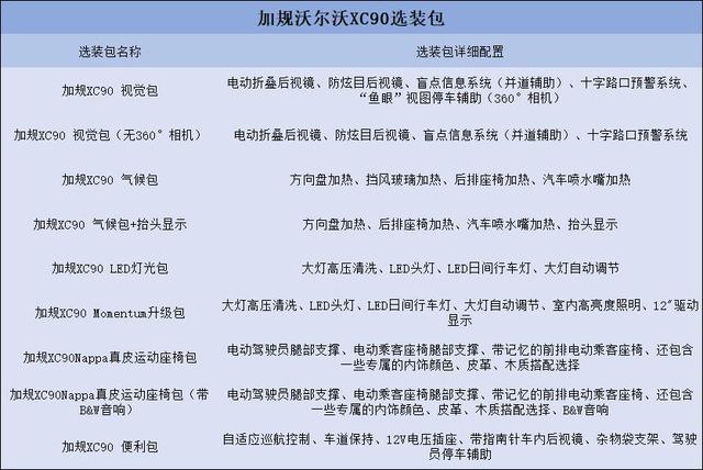 而加规Momentum T6 AWD 7座版的选装包多达9个,分别是:视觉包、视觉包(无360°相机)、气候包、气候包+抬头显示、LED灯光包、Momentum升级包、Nappa真皮运动座椅包、Nappa真皮运动座椅包(带B&W音响)、便利包,所以,想拥有更丰富的个性化配置,加规沃尔沃XC90是更好的选择。
