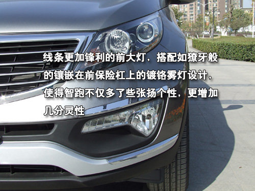 线条更加锋利的前大灯,搭配如獠牙般的镶嵌在前保险杠上的镀铬雾灯设计,使得智跑不仅多了些张扬个性,更增加几分灵性?! ?/p>