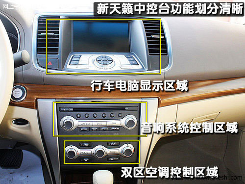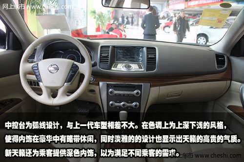 东风日产新天籁整个中控台为弧线设计,与上一代车型相差不大。在色调上为上深下浅的风格,使得内饰在豪华中有略带休闲,同时淡雅的的设计也显示出天籁的高贵的气质。新天籁还为乘客提供深色内饰,以为满足不同乘客的需求。