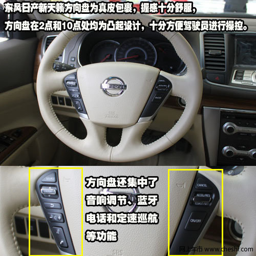 东风日产新天籁方向盘为真皮包裹,握感十分舒服,方向盘在2点和10点处均为凸起设计,十分方便驾驶员进行操控。另外新天籁方向盘还集中了音响调节、蓝牙电话和定速巡航等功能,大大方便了驾驶员在行车中的进行其它功能的操控。