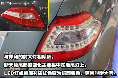 与犀利的前大灯相呼应,新天籁尾部的变化主要集中在后尾灯上,LED灯组的底衬由红色变为镜面银色,更显时尚大气。