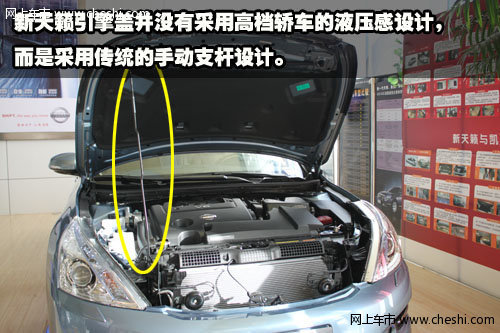 东风日产新天籁的发动机舱发动机舱布局比较规整,走线合理。在发动机盖上辅以隔音材质,同时在靠近发动机后方的部分也设有隔音、隔热层。底盘护板为新天籁在行驶时,对车辆底盘增加了一重?;?。美中不足的则是,新天籁引擎盖并没有采用高档轿车的液压感设计,而是采用传统的手动支杆设计。