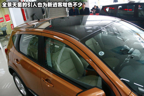 新逍客增加了通览全景式天窗,作为一款城市跨界休旅车型,全景天窗无疑增加了逍客的亮点。但稍有遗憾的是,全景天窗不能打开,只是增加透光量。